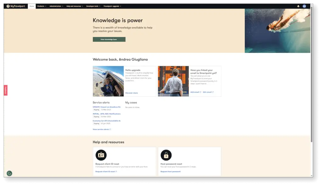 Travelport’s self-service portal for requesting support, accessing tools, and finding key travel insights